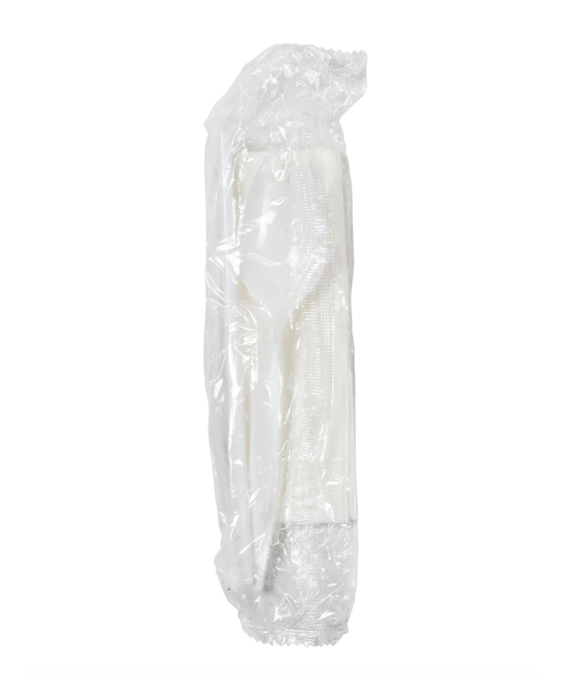 This cutlery set comes in a 3-piece kit. The cutlery in this set has a white color. They are made from durable medium weight material. Each set contains a Spork, 10x10 Napkin, and a milk straw making them perfect for school meals.