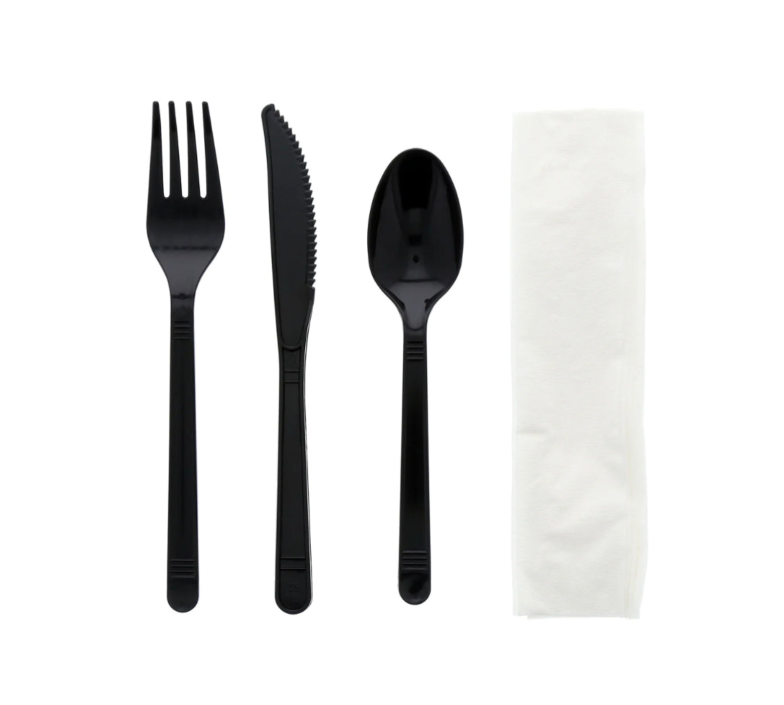These cutlery kits contain a black plastic fork, knife, spoon, and 12" x 13" napkin. Cutlery kits are wrapped to ensure they stay sanitary prior to use, and can easily be placed in takeout packaging. They offer convenience for staff and customers and are a perfect option for any takeout or delivery food establishment.