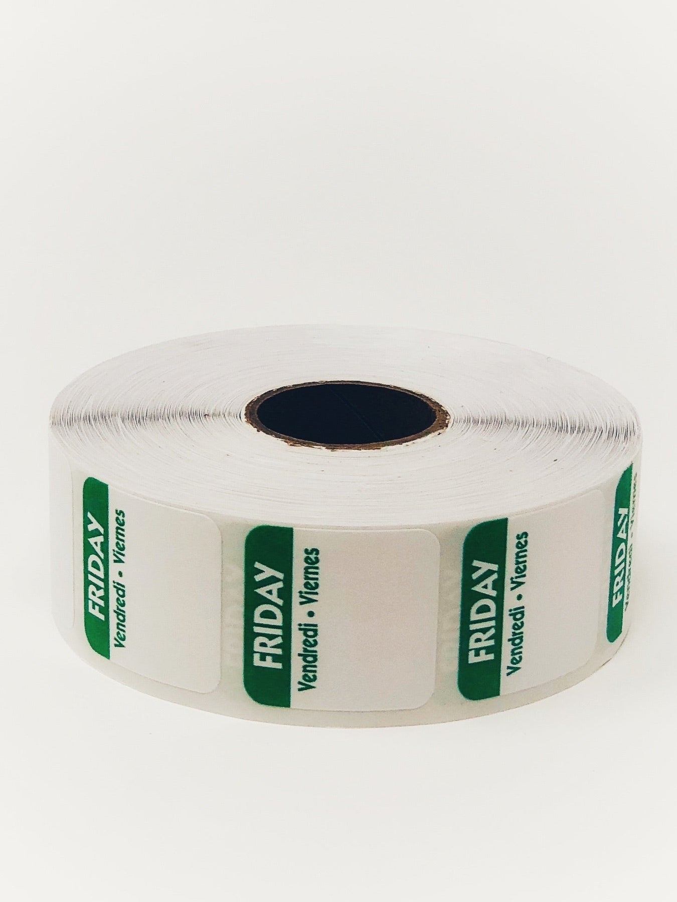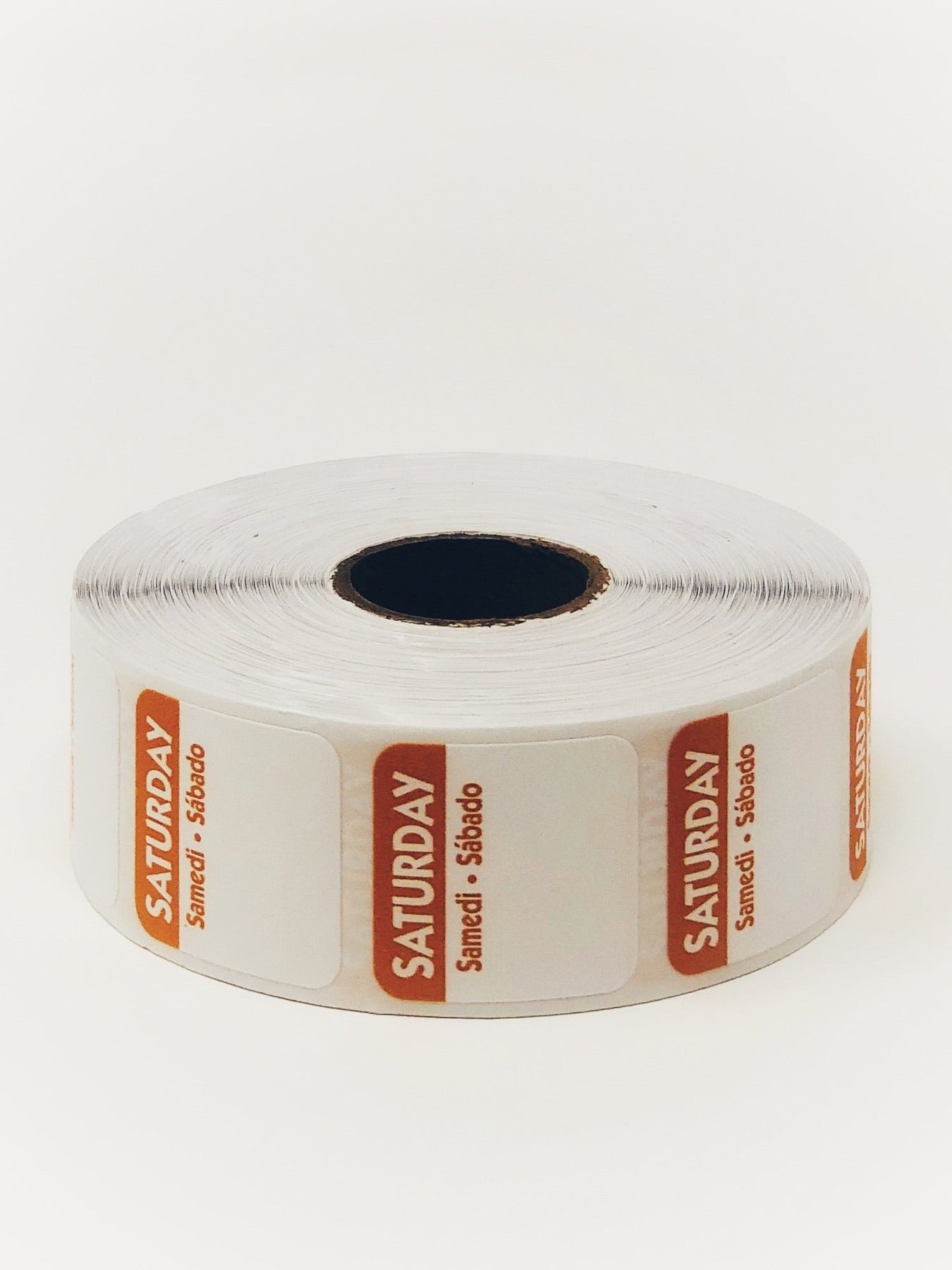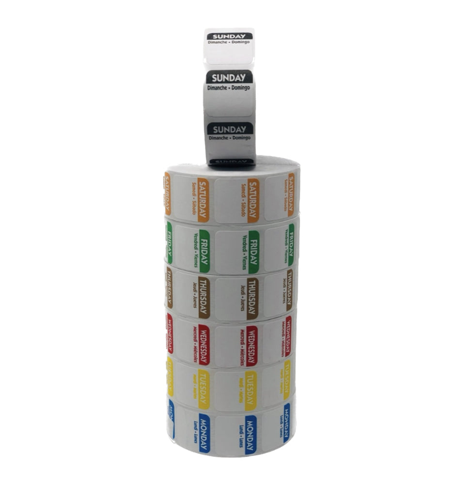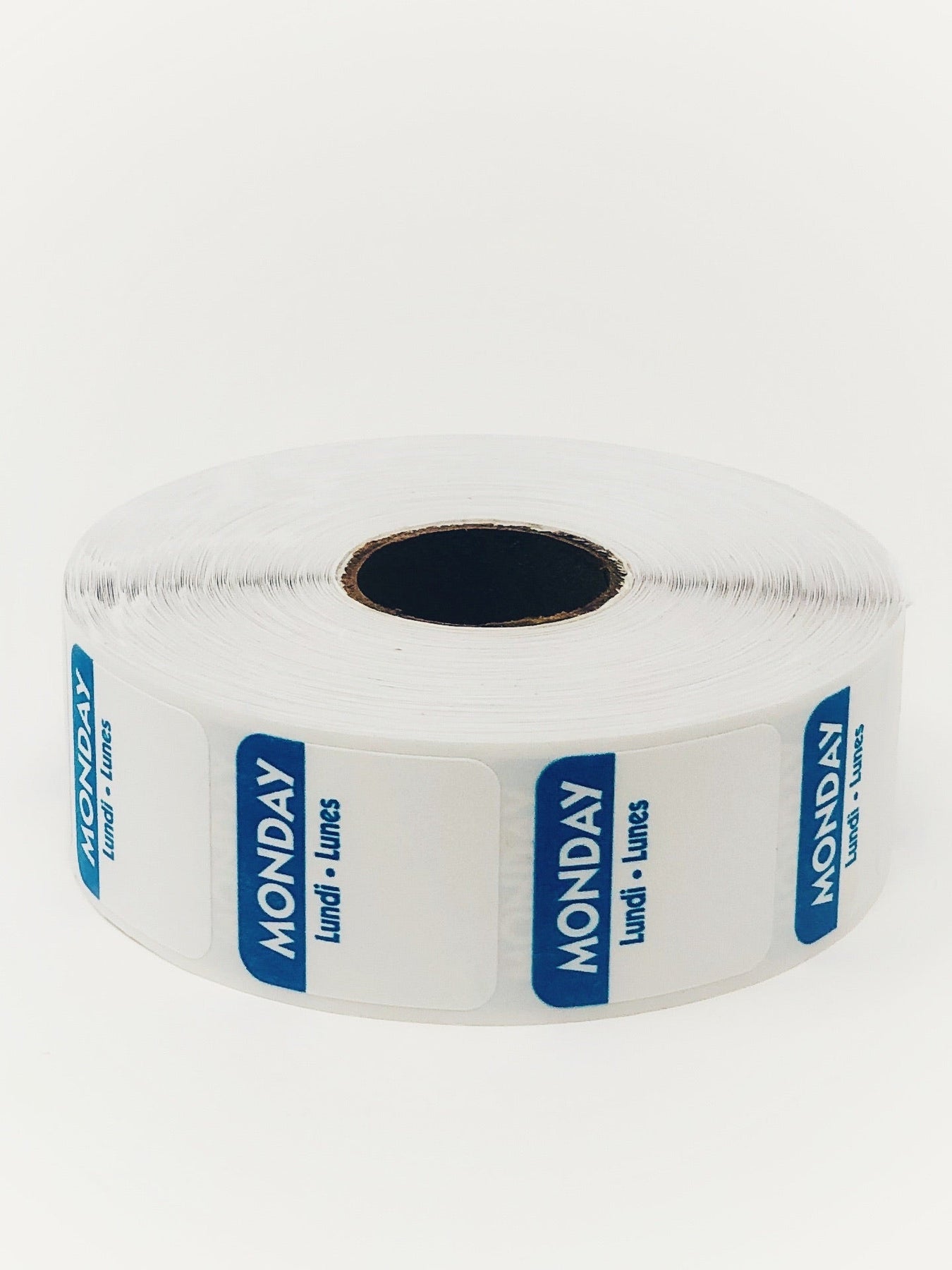 Removable paper day of week labels adhere to surfaces and peel away after use or easily wash away with warm water. Labels are sold 1000 per roll.