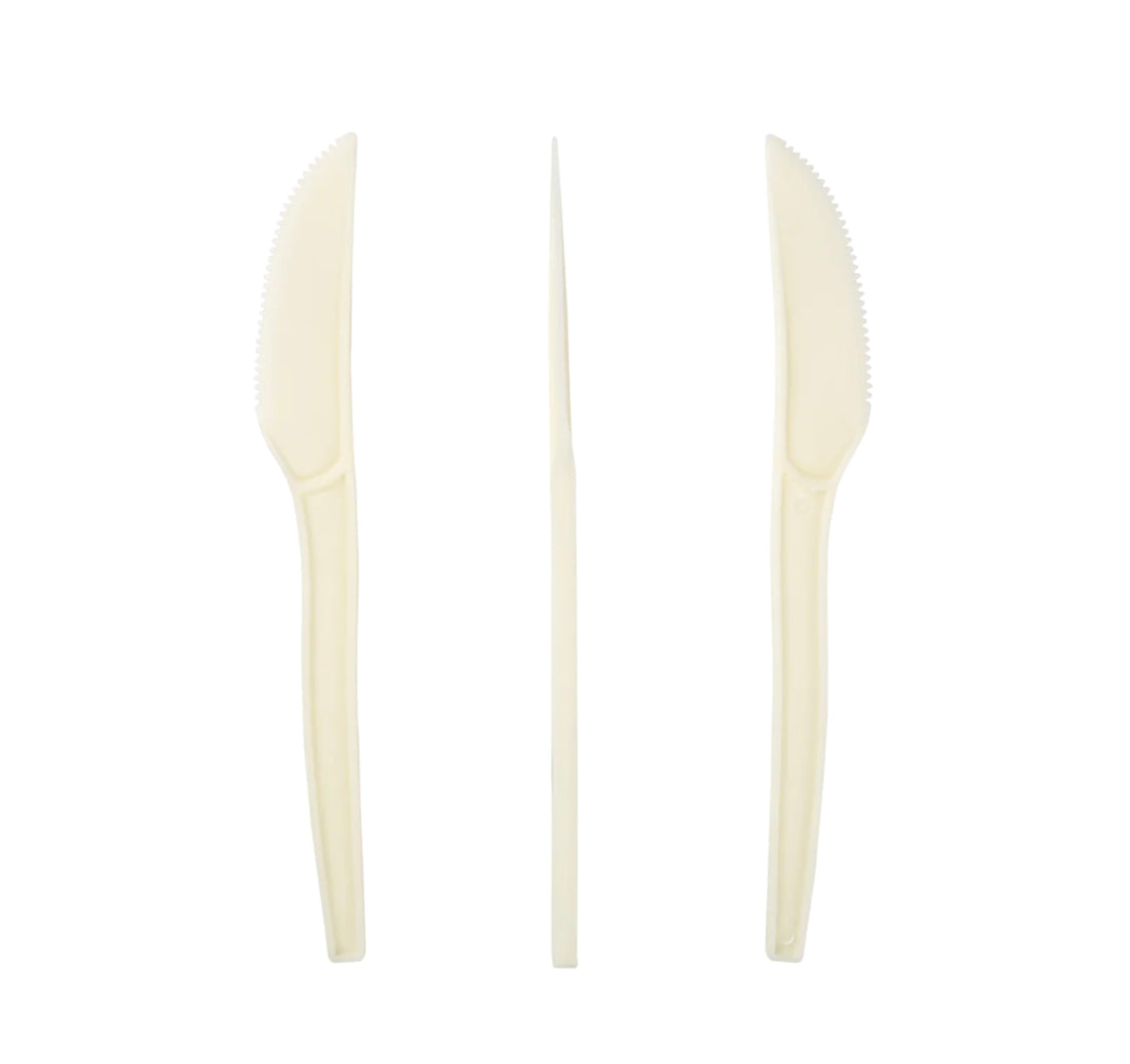 These Plant Starch or PSM Knives from PrimeWare are great for serving high heat dishes and have a high heat tolerance. They are made from plant starch material resin which is produced from corn and potato starch. PSM cutlery is made from 80% PSM and 20% polypropylene materials, which reduces the consumption of the non-renewable fossil fuels required to make conventional plastic cutlery. They are a more sustainable choice than traditional plastic cutlery which uses 100% plastic.