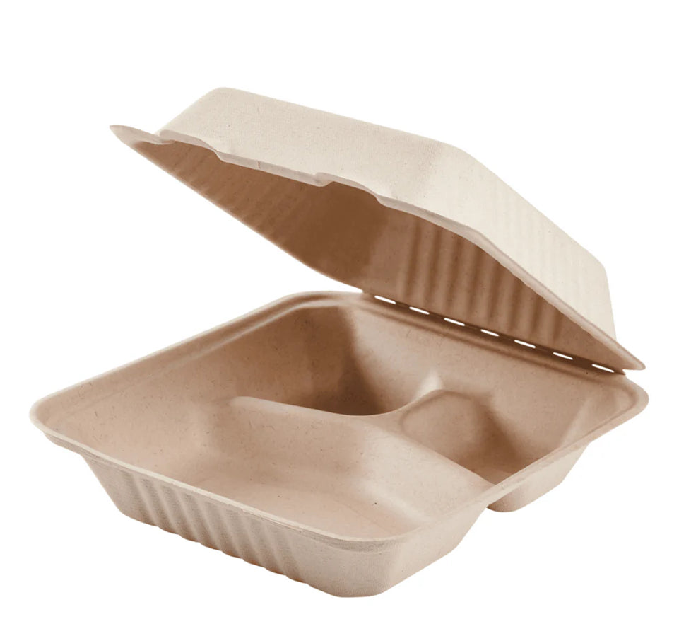 Bagasse Hinged Containers are the perfect eco-friendly alternative to styrofoam or plastic hinged containers! Bagasse is made from sugar cane fibers that are left over after the extraction of the sugar. The fibers are strong and durable making them a great source of sustainable material for compostable food packaging. These bagasse hinged containers are microwaveable-safe and free of any PFAS!