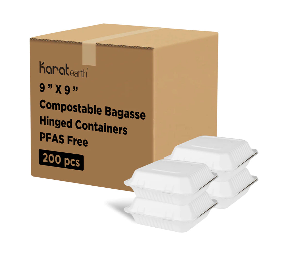 Bagasse Hinged Containers are the perfect eco-friendly alternative to Styrofoam or plastic hinged containers! Bagasse is made from sugar cane fibers that are left over after the extraction of the sugar. The fibers are strong and durable making them a great source of sustainable material for compostable food packaging. These bagasse hinged containers are microwaveable-safe and free of any PFAS!
